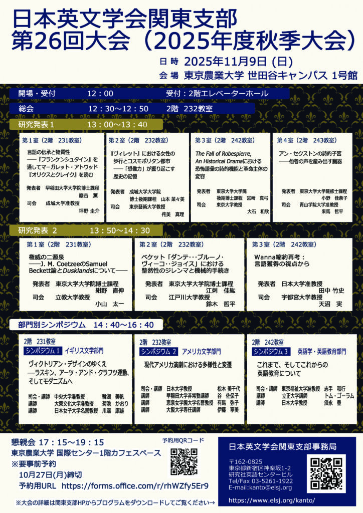 2025年11月9日、東京農業大学(世田谷キャンパス)で開催された「日本英文学会関東支部 第26回大会」の英文学・英語教育部門シンポジウムにゲストスピーカーとして登壇し、発表を行いました。(>>続き)